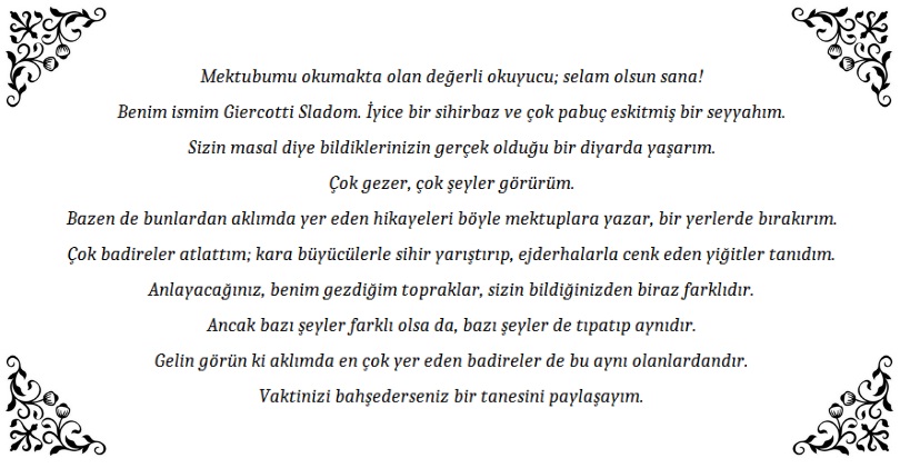 Hayatını yollarda geçiren ihtiyar sihirbaz bir yandan büyülü maceralar yaşarken, bir yandan da tecrübe ettiği mühim olaylar hakkında biraz havadis, biraz nasihat, biraz da muhabbet niyetiyle mektuplar yazarak, okuyanların kulağına küpe olması dileğiyle bunları bir yerlerde bırakıyor.